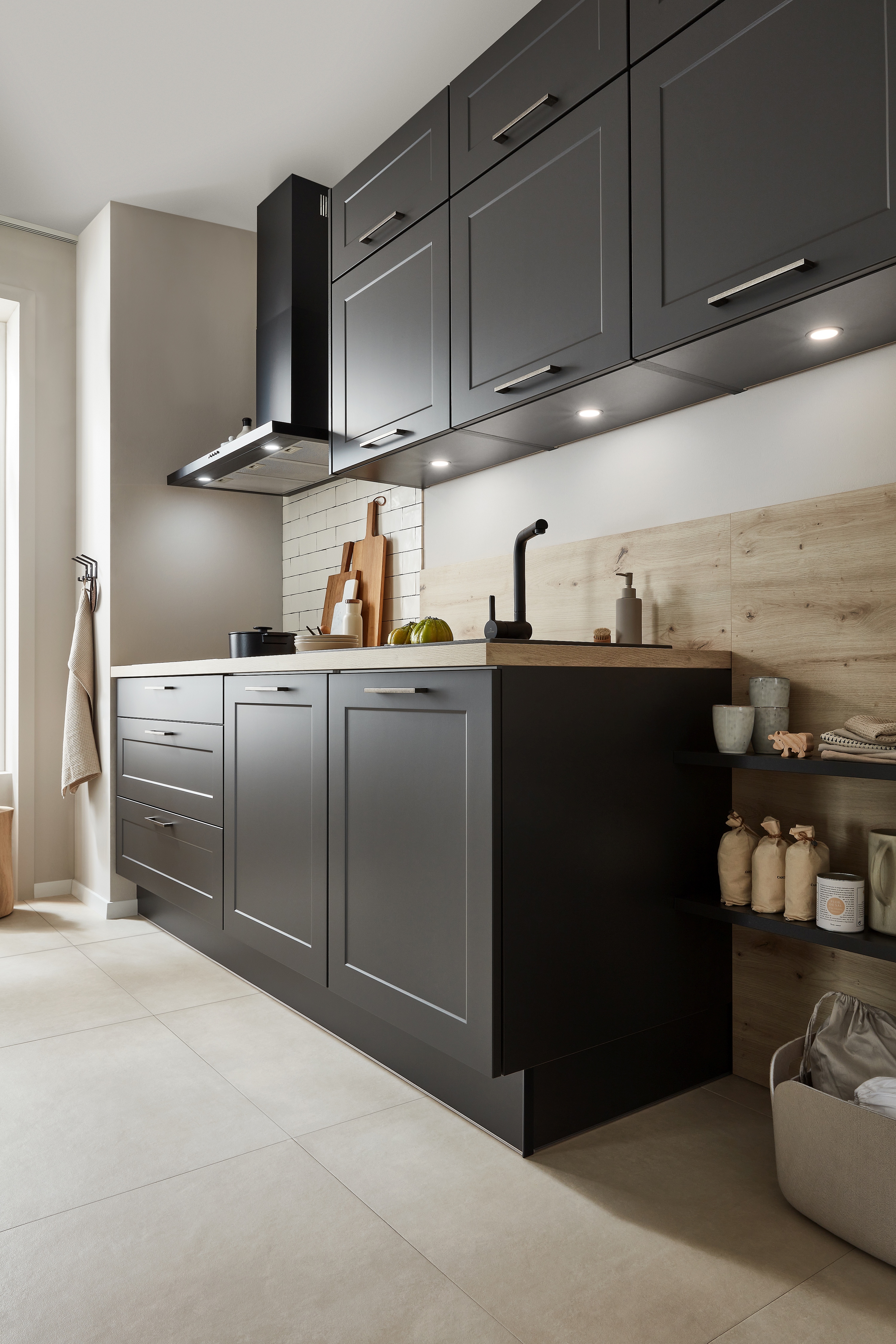 So wirkt optisch alles wie aus einem Guss. Wenn Sie sich für eine grifflose Küche entscheiden, beweisen Sie Ihr Stilbewusstsein für eine klare Linienführung. Impuls bietet dafür neue Frontenfarben, darunter Vulkanbraun, Schiefergrau, und Alby Blue mit passenden Wangen und gleichfarbigem Sockel. Matt und glänzend lässt sich toll kombinieren. Bei Impuls bekommen Sie jedoch auch Holzoptik vom Feinsten: Ob Seeahorn, Vintage-Eiche, Oregon-Eiche, Eiche hell oder Eiche Schwarz – die Impuls Dekore vereinen die natürliche Ästhetik von Holz mit der Strapazierfähigkeit pflegeleichter Oberflächen. Und in welcher Richtung die Maserung verlaufen soll – vertikal oder horizontal – bestimmen Sie! Seitenschränke mit flexiblen Organisationssystemen garantieren Stauraum nach Maß. Apothekerauszüge bieten Übersichtlichkeit und Bedienkomfort von beiden Seiten. Nahezu lautlos gleiten sie aus dem Schrank, denn in puncto Technik setzt Impuls auf geprüfte Markenqualität. Dank des integrierten Komforteinzugs schließen sich Auszüge selbstständig und flüsterleise. Die serienmäßigen Marken-Clipscharniere sind dreidimensional verstellbar.