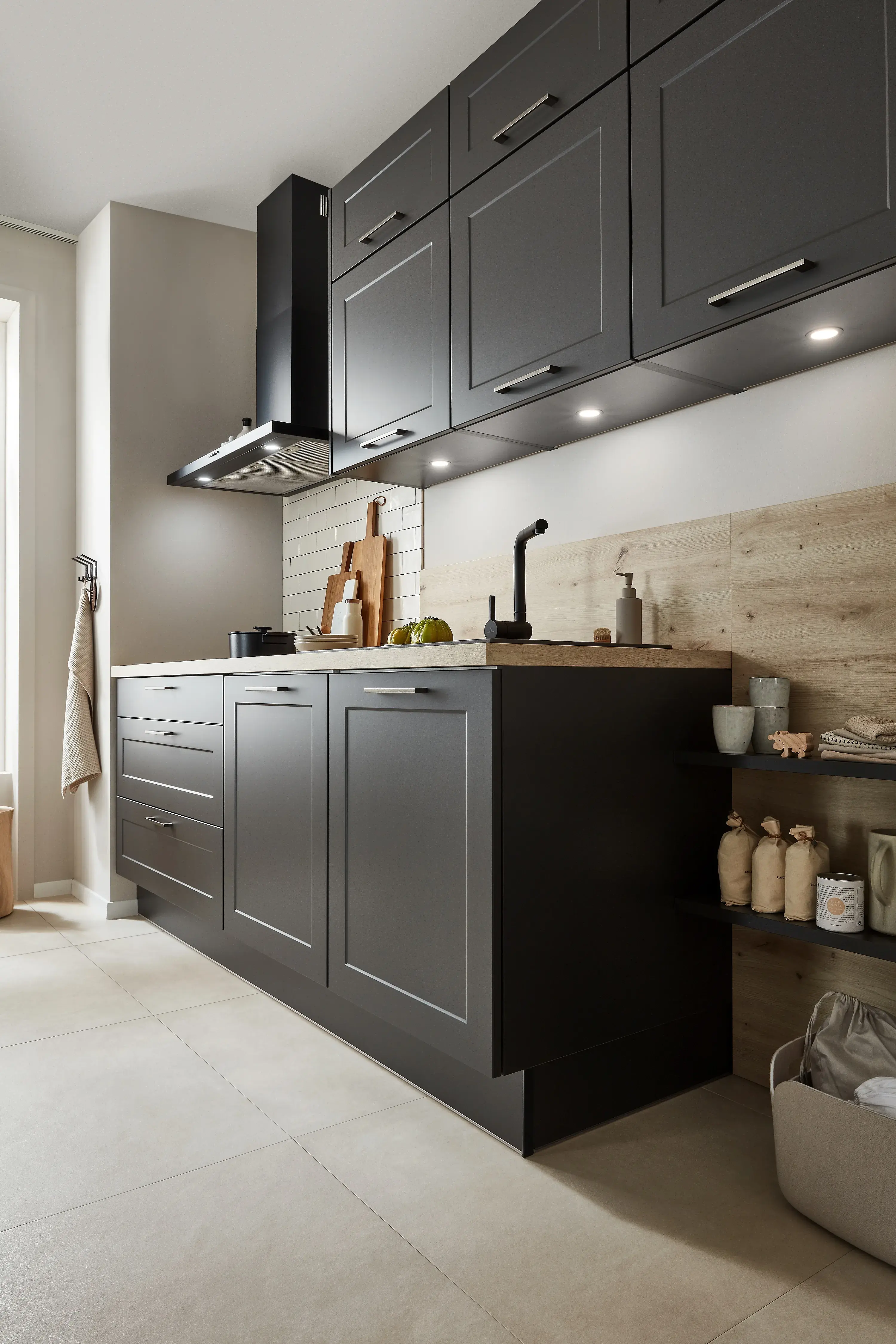 Bei den Landhausfronten setzt Impuls auf den traditionellen Shaker-Stil, der mit seiner schlichten, aber raffinierten Handwerkskunst und einem Verzicht auf alles Überflüssige als wichtiger Vorbote der Moderne gilt. Typische Elemente sind facettierte Rahmenfronten in der klassischen Variante – hier in Alby Blue und modern in Schwarz. Die Ordnungsprinzipien des Stils bauen auf besonders geräumigen Highboards, Seiten- und Aufsatzschränken auf.