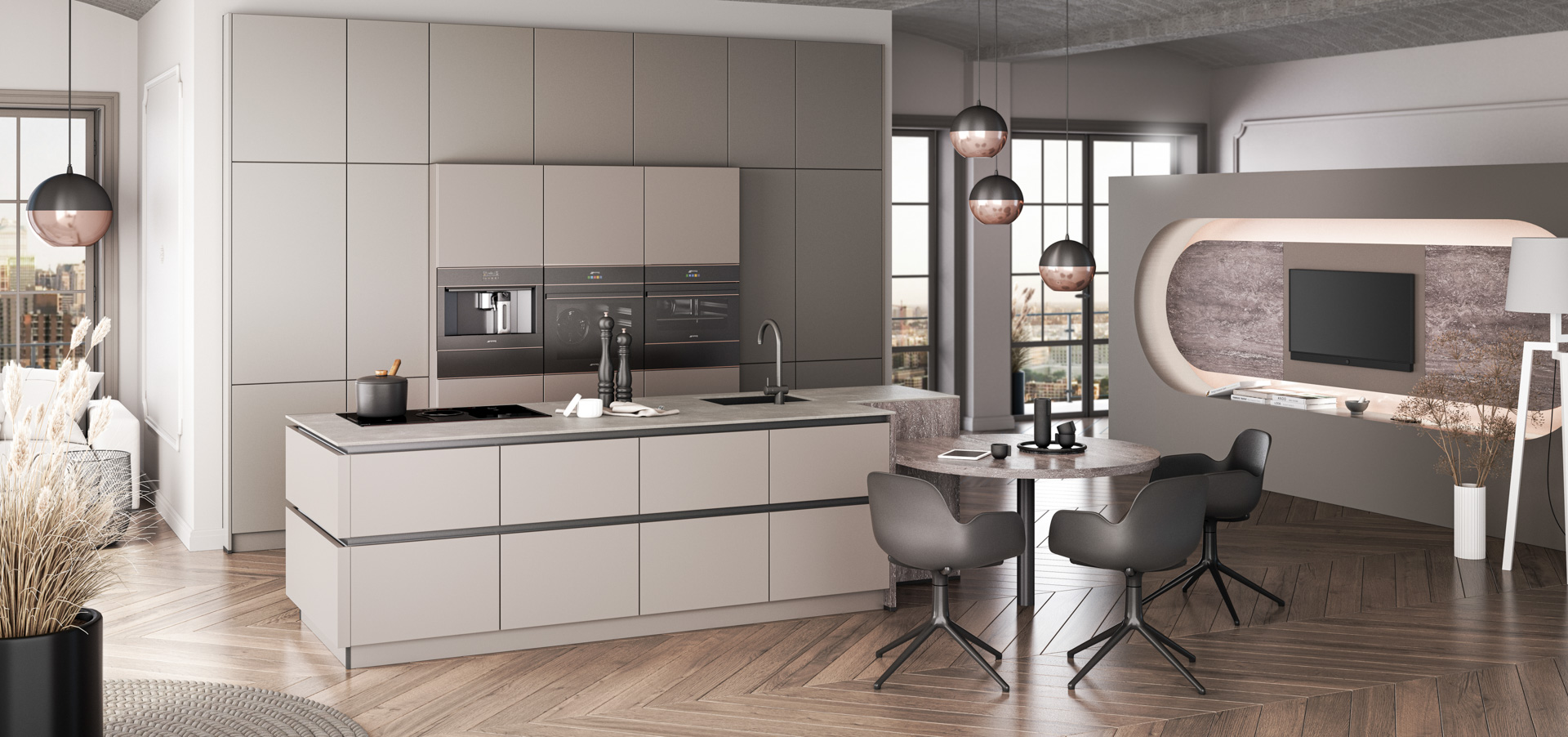 Diese warmen Grautöne bieten unzählige Gestaltungs­möglichkeiten und schaffen eine warme, einladende Atmosphäre. Erleben Sie die exklusive Schönheit von FEEL: Mit ihrer samtweichen Oberfläche lädt diese Küche zum Anfassen und Verweilen ein.