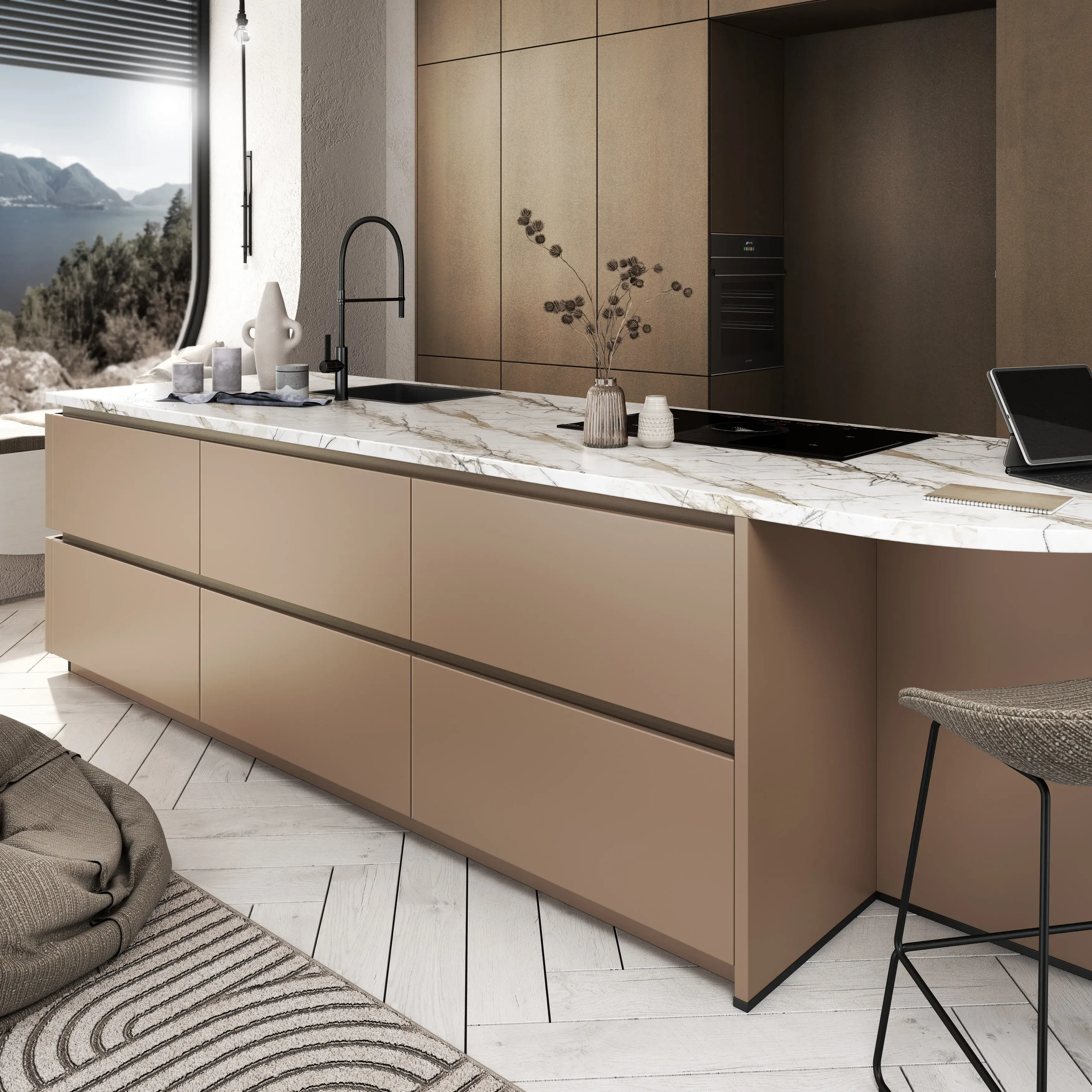 Die artego-Linie Q3 XL bietet griffloses, modernes Design in ergonomischer XL-Höhe. Rund 9 % mehr Stauraum gegenüber Q3 vereint Komfort, Funktionalität und optimale Platzausnutzung. Galvano Bronze verleiht dieser Küche eine edle, fast modellierte Ausstrahlung. Die metallisch schimmernde Oberfläche mit bronzefarbenen Nuancen erzeugt ein Spiel aus Licht und Struktur – mal warm und wohnlich, mal kühl und modern. Ideal für alle, die ein ausdrucksstarkes Statement setzen möchten.